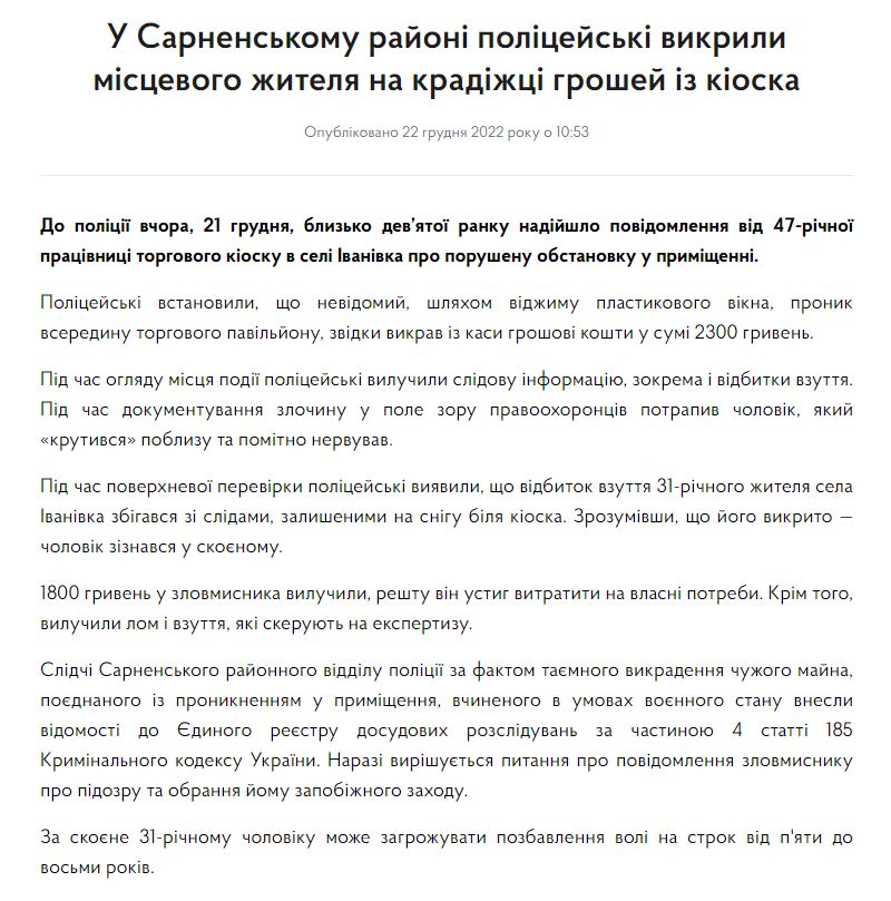 В Сарненском районе Ровенкой области полиция разоблачила по следам на снегу местного жителя, который украл из киоска 2300 гривен.
