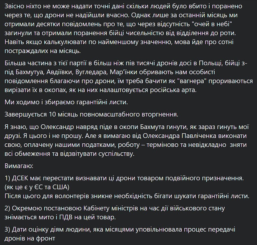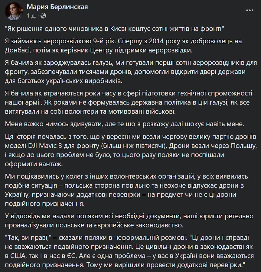 Так, волонтер Мария Берлинская пишет, что в сентябре при заказе большой партии (более 500 единиц) дронов DJI Mavic 3 польская сторона устроила для партии дополнительные проверки, мотивируя это тем, что дроны могут быть двойного назначения.