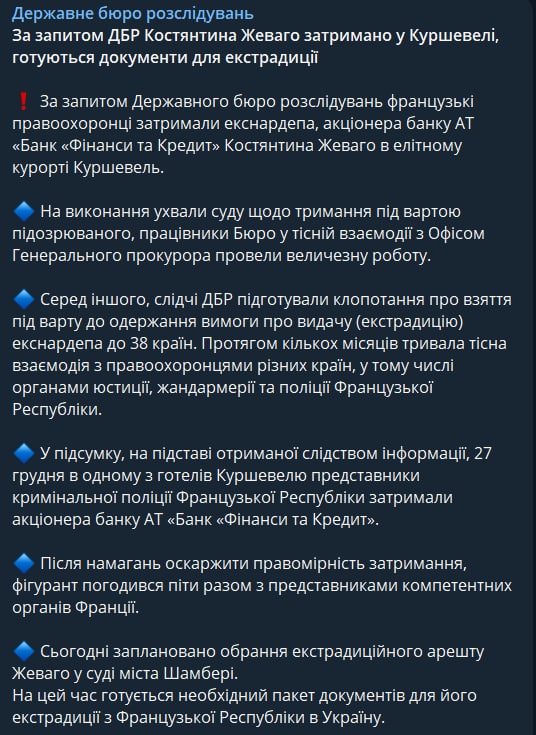 Представители криминальной полиции Франции задержали Константина Жеваго 27 декабря в одном из отелей Куршавеля по запросу ГБР. Идет подготовка к экстрадиции.