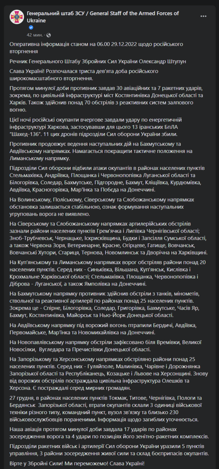В четверг, 29 декабря, в Украине идет уже 309-й день войны с РФ.