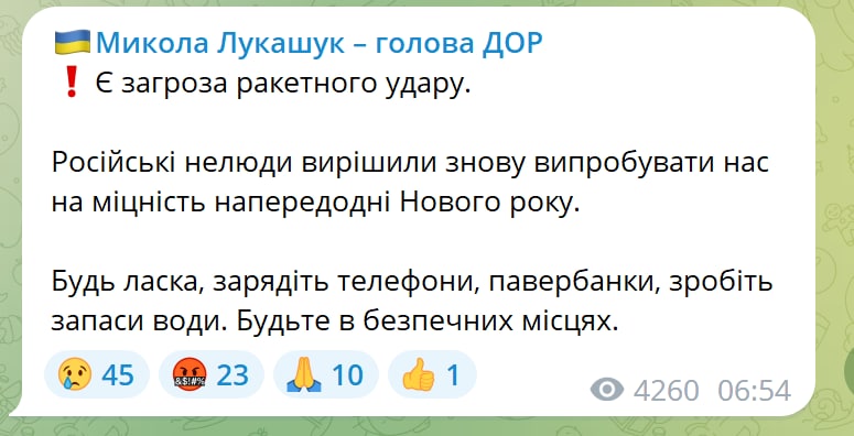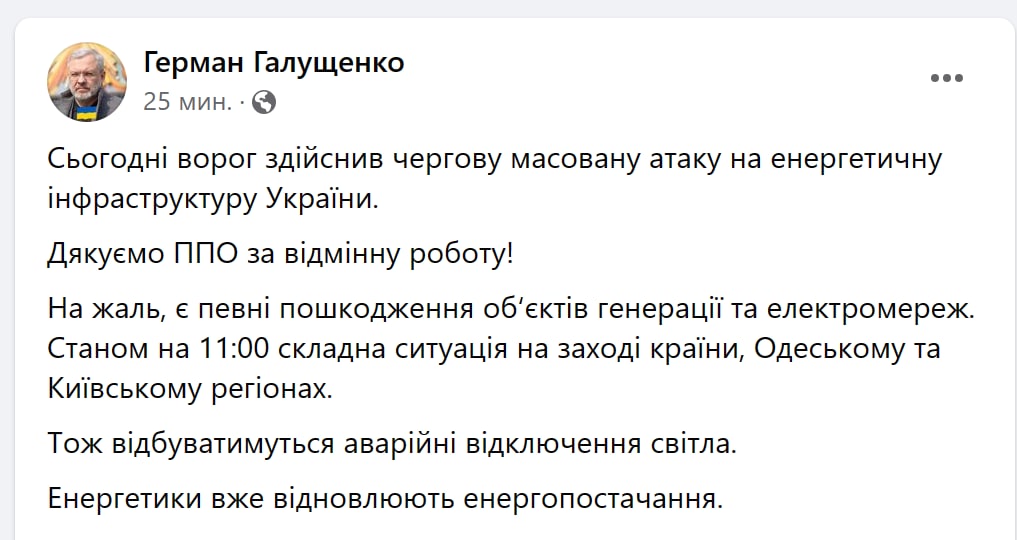 • Поблагодарил ПВО и Воздушные силы за отражение ракетной атаки. Рассказал, что было несколько прилетов, поэтому сейчас отключения есть в ряде регионов. Сложнее всего в Киеве и области, Одессе и области, Львовской области, Херсоне и области, Винницкой области и в Закарпатье. Допустил, что россияне могут еще раз попробовать нанести удар до Нового года.
