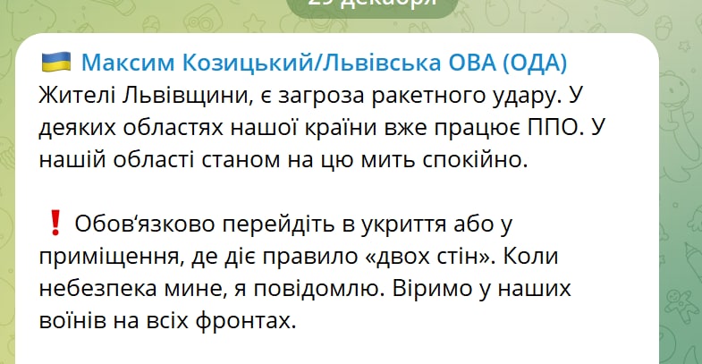 08:50 Есть угроза ракетного удара по Львовской области, заявил губернатор Максим Козицкий.