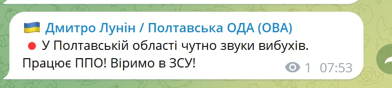 08:35 Работает ПВО в Житомирской области, сообщают телеграм-каналы. Там слышны взрывы.