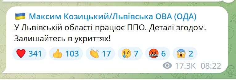 09:25 Губернатор Львовской области заявил о работе ПВО и призвал оставаться в убежищах.