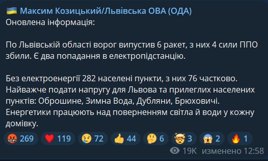 «Самая сложная ситуация остается во Львове и окружающих общинах, а также в Яворовском районе. Работа не прекращается. Ожидаем, что до конца этих суток все жители Львовской области будут получать питание в соответствии с графиками почасовых отключений», – уточнил он.
