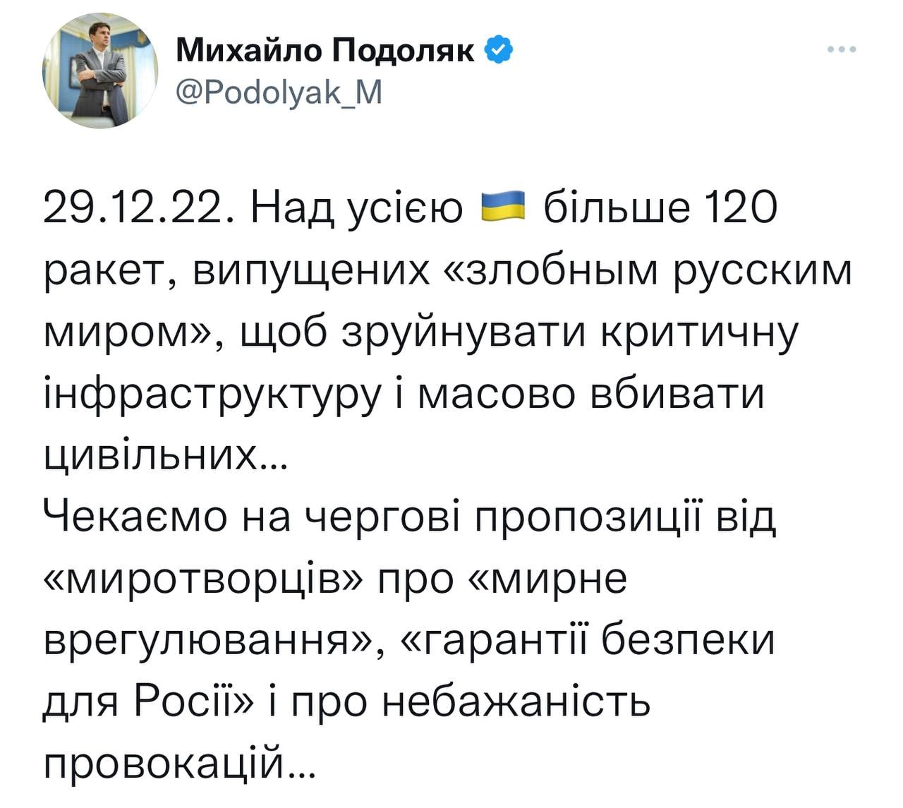 "Над всей Украиной более 120 ракет, выпущенных "злобным русским миром", чтобы разрушить критическую инфраструктуру и массово убивать гражданских… Ждем очередных предложений от "миротворцев" о "мирном урегулировании", "гарантии безопасности для России" и о нежелательности провокаций…" - написал он.