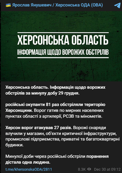 "Российские оккупанты 81 раз обстреляли территорию Херсонщины. Враг стрелял по мирным населенным пунктам области из артиллерии, РСЗО и минометов", - написал Янушевич в своем телеграм-канале.