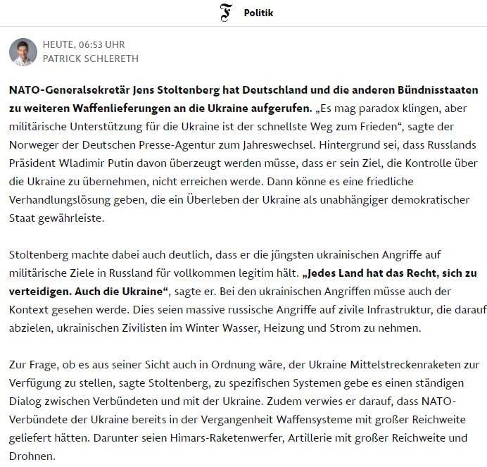 "Это может звучать парадоксально, но военная поддержка Украины - это самый быстрый путь к миру", - заявил он и добавил, что украинские атаки на военные объекты в России являются абсолютно законными.