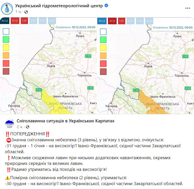 31 декабря и 1 января из-за оттепели на высокогорье Ивано-Франковской и восточной части Закарпатской областей ожидается значительная снеголавинная опасность (3 уровень).