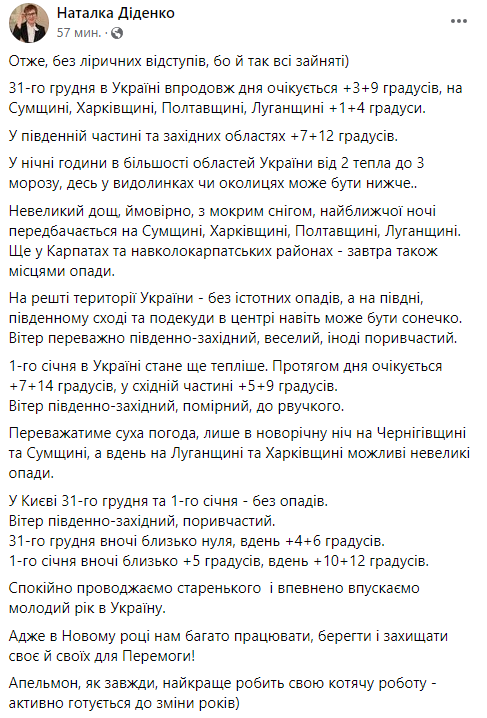 В Украине 31 декабря в течение дня ожидается +3...+9 градусов, в Сумской, Харьковской, Полтавской, Луганской областях - +1...+4 градуса. В южной части страны и западных областях столбики термометров поднимутся до отметок +7...+12 градусов. В ночные часы в большинстве областей Украины - от +2 до -3 градусов.
