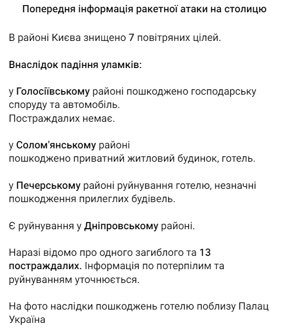 • в Печерском районе разрушение гостиницы, незначительные повреждения близлежащих построек, в том числе - Дворца "Украина".