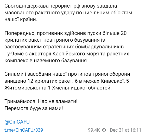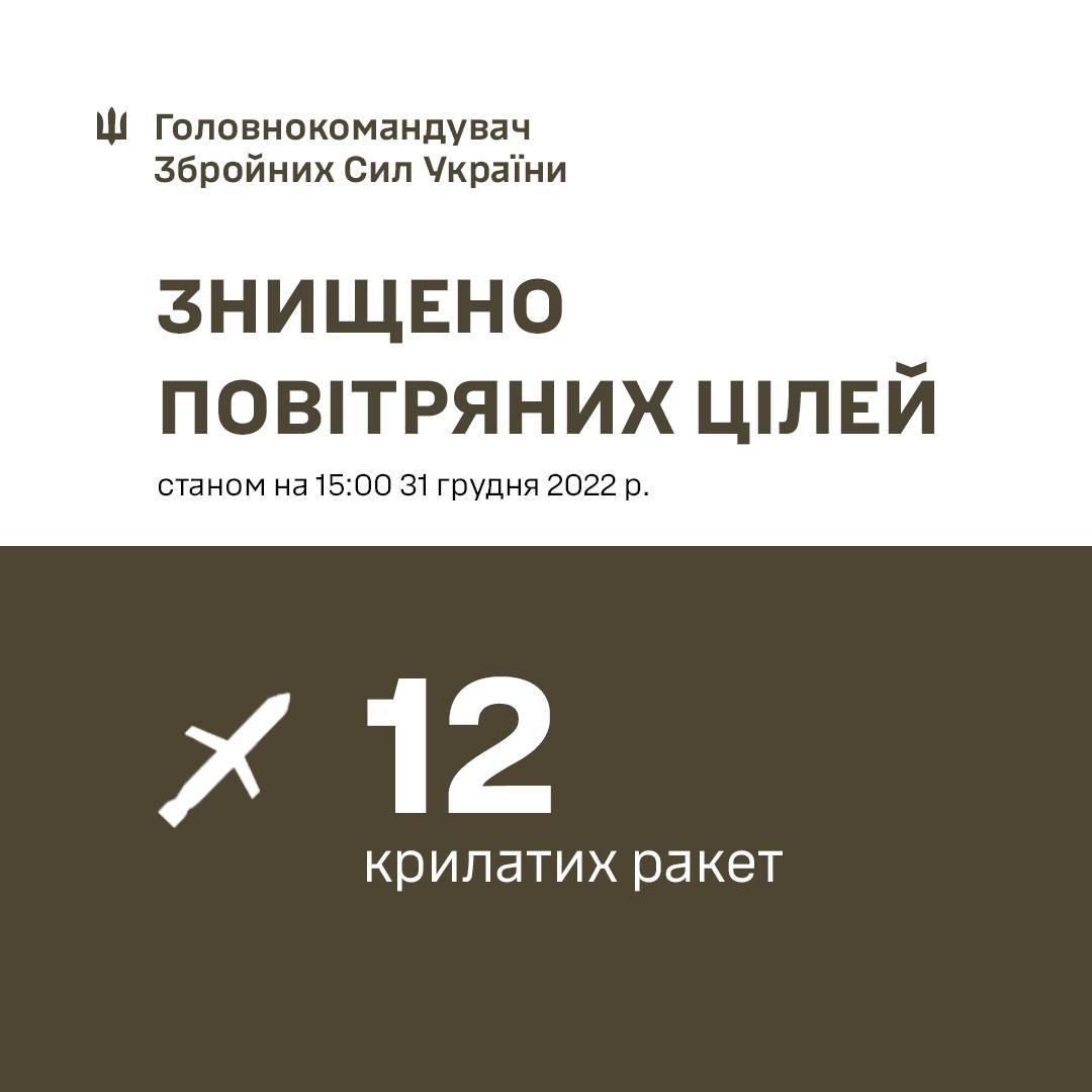 Главнокомандующий ВСУ Валерий Залужный сообщает, что Россия сегодня, 31 декабря, выпустила по Украине более 20 крылатых ракет. Украинские силы ПВО уничтожили 12 из них.