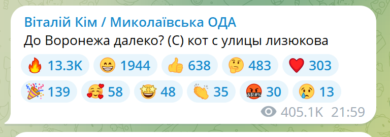 Из официальных лиц к этой кампании подключился губернатор Николаевской области Виталий Ким. Он намекнул на прилет по Воронежу на улице Лизюкова (она стала знаменитой благодаря мультфильму "Котёнок с улицы Лизюкова").