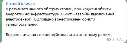 06.35 В результате ночного обстрела Киева повреждены объекты энергоинфраструктуры.