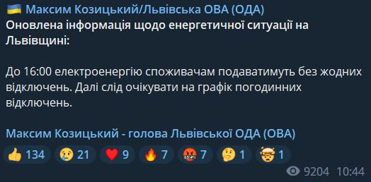 11.00 Во Львовской области до 16:00 не будет отключений света, сообщают местные власти.