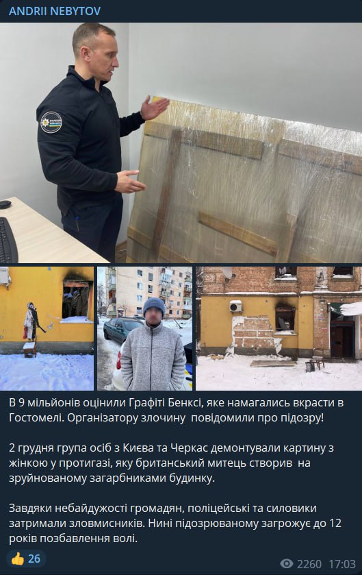 10:42 Граффити уличного художника Бэнкси, которое пытались похитить в Гостомеле, оценили в 9 миллионов гривен, сообщил начальник Киевского облуправления полиции Андрей Небитов.