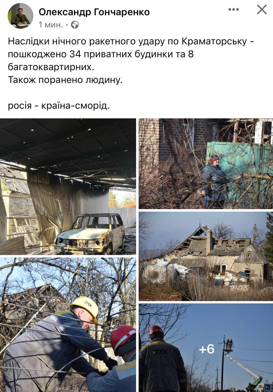 12.25 Мэр Краматорска Александр Гончаренко у себя на странице в Facebook рассказал о последствиях ночного ракетного удара.