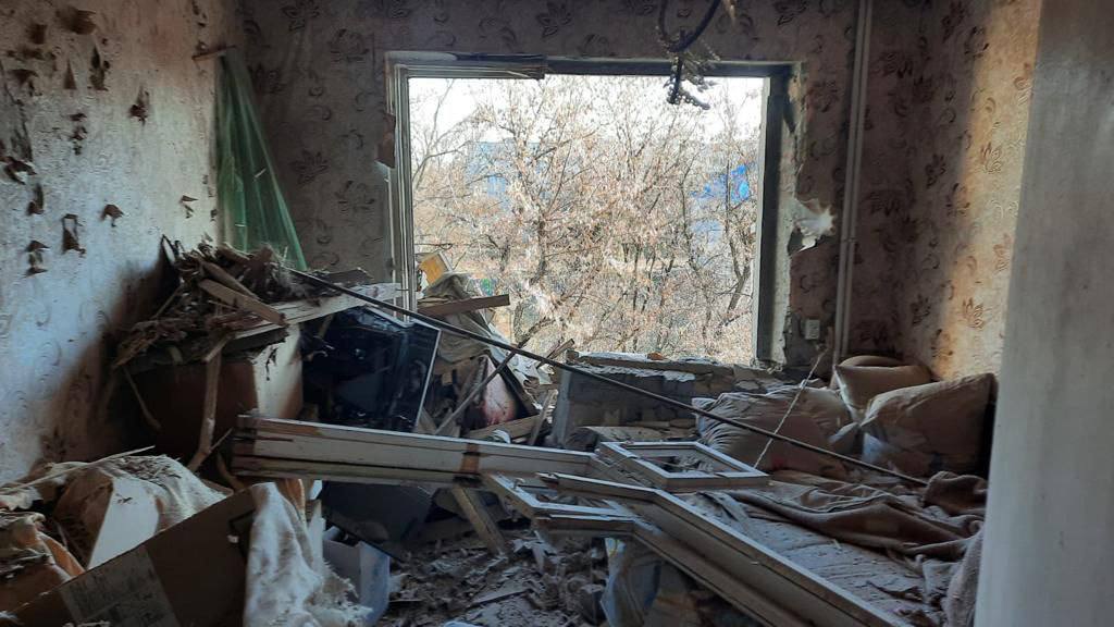 Предварительно, один снаряд попал непосредственно в многоэтажку, также поврежден объект инфраструктуры водообеспечения и выбиты окна в зданиях недалеко от места попадания.