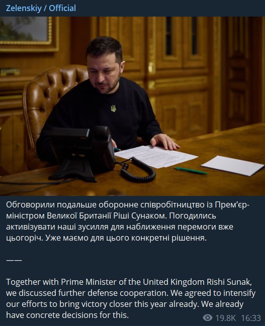 Помимо этого, ведется работа, направленная на то, чтобы в ближайшие недели и месяцы передать Украине дополнительную военную технику, чтобы обеспечить ее победу на поле боя", — говорится в сообщении, распространенном премьерской канцелярией после состоявшегося телефонного разговора между Риши Сунаком и Владимиром Зеленским.