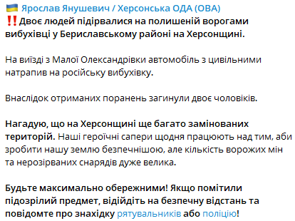 В Бериславском районе Херсонской области на выезде из Малой Александровки автомобиль с гражданскими наехал на российскую взрывчатку. В результате двое мужчин погибли от полученных ранений.