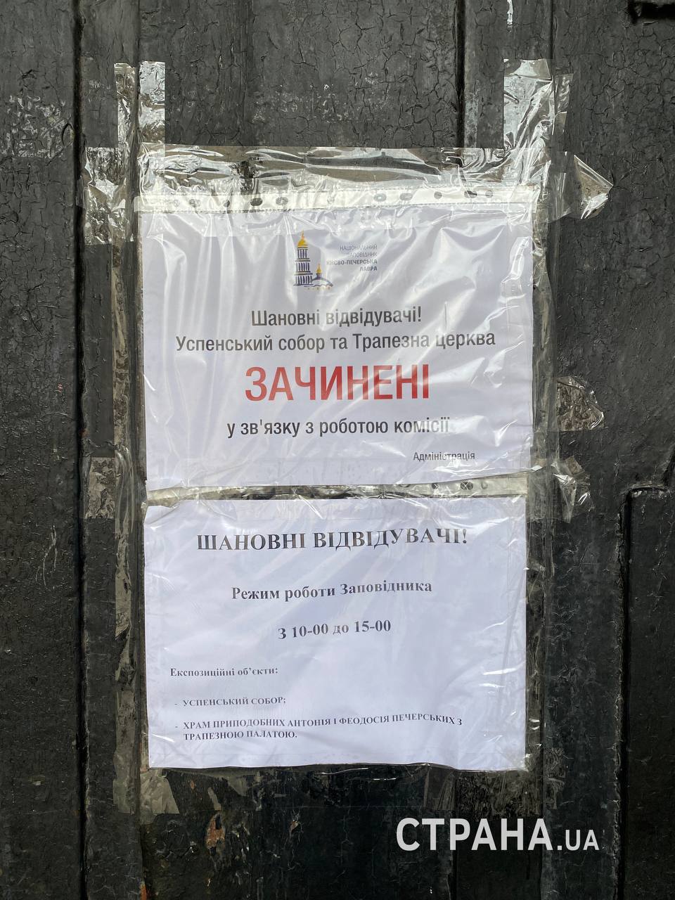 3 января территория Национального заповедника Киево-Печерская Лавра, включая находящиеся на территории Верхней лавры Успенский собор и Трапезную церковь, все еще закрыта для посетителей из-за работы комиссии. Об этом свидетельствует табличка установленная у входа в заповедник.