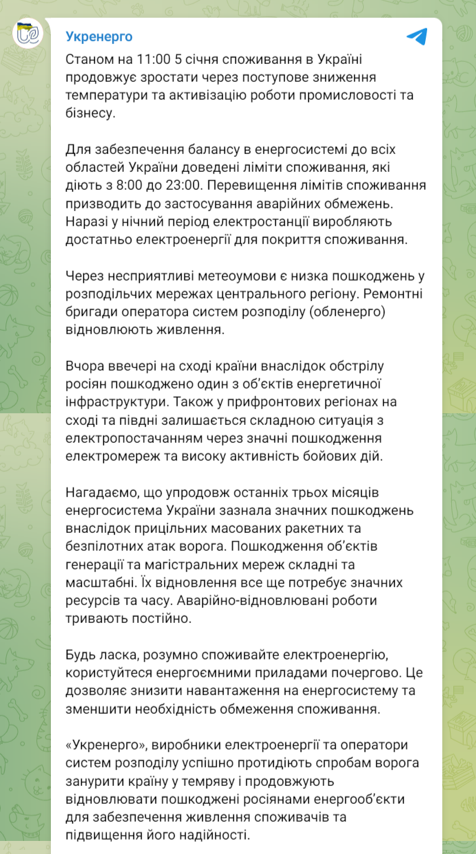 В Украине 5 января продолжает расти потребление электроэнергии из-за постепенного снижения температуры и активизации работы промышленности и бизнеса. До всех областей Украины доведены лимиты потребления, действующие с 8:00 до 23:00.
