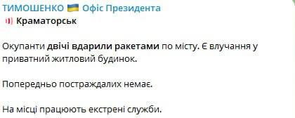 13.15 В Офисе президента пишут о двух ударов сегодня по Краматорску. По предварительным данным пострадавших нет.