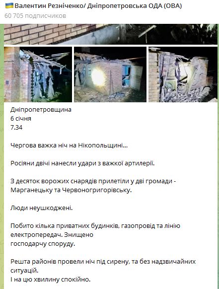 07.45 Ночью 6 января россияне дважды нанесли удары из тяжелой артиллерии по Днепропетровской области.