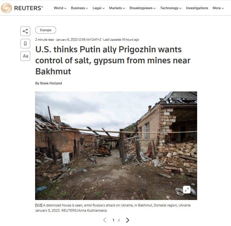 06.30 Глава ЧВК "Вагнер" Пригожин заинтересован в том, чтобы получить контроль над соляными и гипсовыми месторождениями около Бахмута.