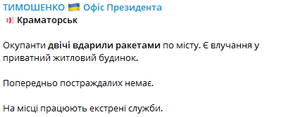Сегодня, 6 января, по Краматорску российские войска дважды ударили ракетами. Есть попадание в частный жилой дом.