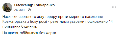 Мэр города Александр Гончаренко уточнил, что в результате сегодняшнего обстрела россиян в Краматорске повреждены 14 частных домов. Обошлось без жертв.