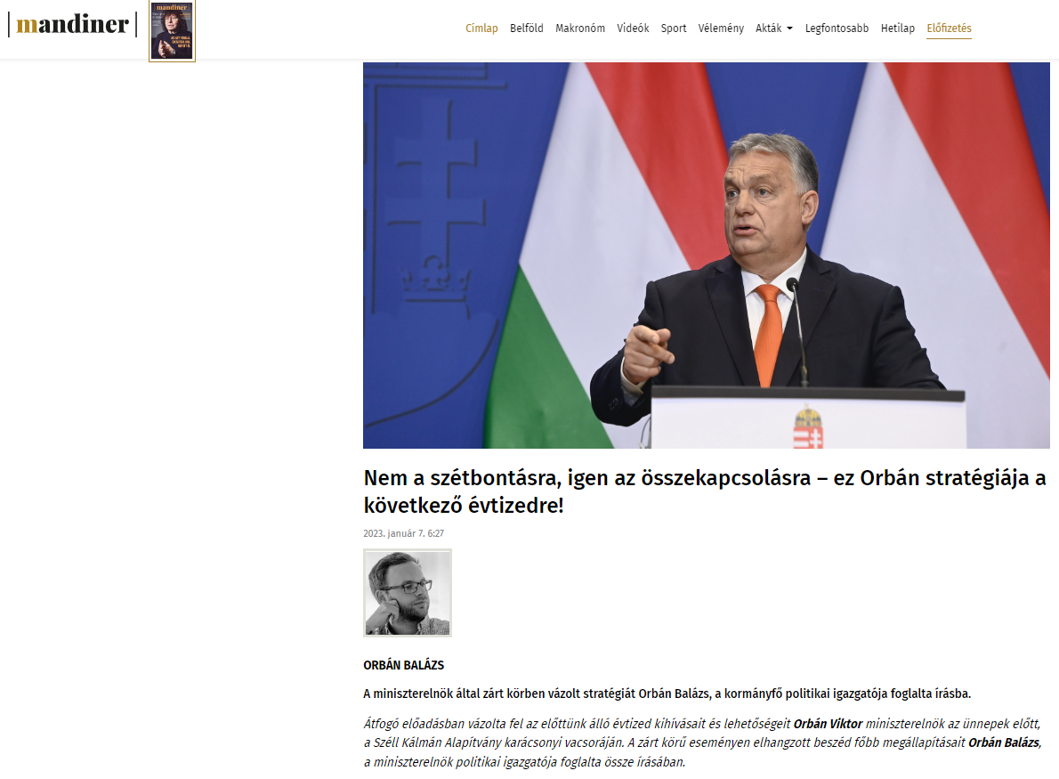 Об этом Орбан заявил в своей в речи на рождественском ужине Фонда имени Селла Калмана (венгерского политического деятеля конца XIX - начала ХХ века), тезисы которой изложил его политический советник Балаш Орбан в статье для издания Mandiner.