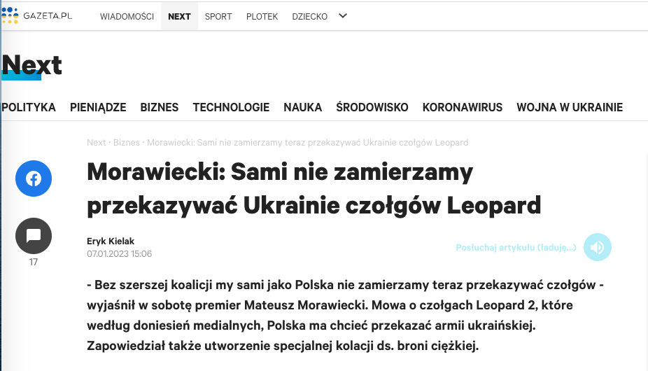 "Мы сами не собираемся передавать свои танки. Без более широкой коалиции Польша сама по себе не собирается сейчас передавать эти танки", - сказал он на пресс-конференции.