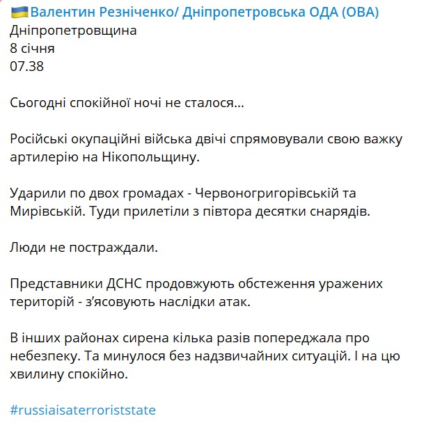 Об этом в телеграм-канале сообщил глава Днепропетровской ОВА Валентин Резниченко.
