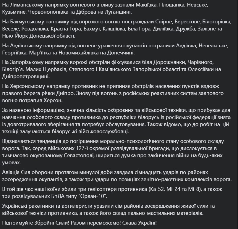 Подразделения Сил обороны Украины отбили атаки в районах населенных пунктов Стельмаховка и Червонопоповка Луганской области и Соледар, Красная Гора, Подгородное, Бахмут, Клещеевка, Водяное, Первомайское, Красногоровка, Марьинка, Победа и Новомихайловка в Донецкой области.