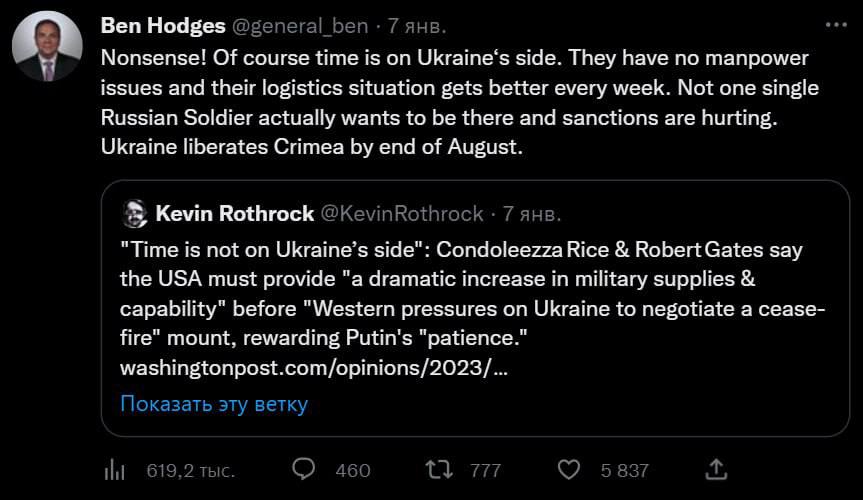 В сентябре 2022 года Ходжес заявлял, что Украина может вернуть Крым в течение года, а 15 марта прошлого года Бен Ходжес говорил, что через 10 дней россияне больше не смогут воевать, поскольку у них закончатся боеприпасы.