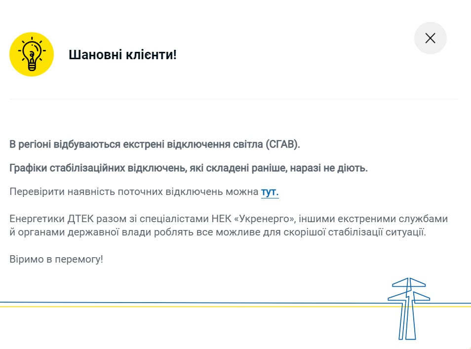 В Днепропетровской области действуют экстренные отключения света, стабилизационные графики не действуют.