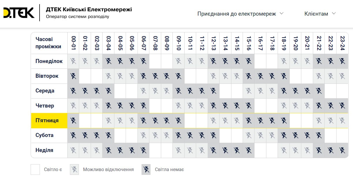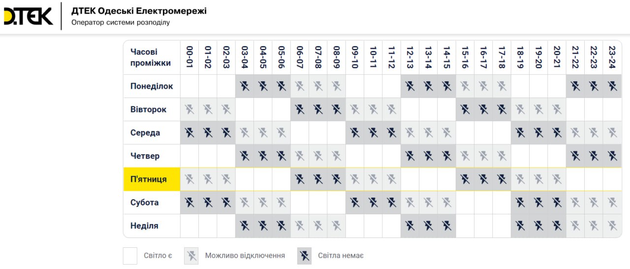 В Киеве и Одессе идут отключения по графикам. Киевляне, как и раньше, получают 2 часа гарантированного света, 3 часа вероятных и 4 часа обязательных отключений, одесситы - 3 часа гарантированной электроэнергии, 3 вероятных и 3 часа обязательных отключений, свидетельствует информация на региональных сайтах ДТЭК.