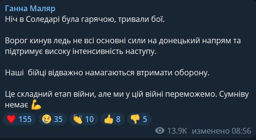 "Ночь в Соледаре была жаркой, продолжались бои. Враг бросил почти все основные силы на Донецкое направление и поддерживает высокую интенсивность наступления", - пишет в своем Telegram замминистра обороны Анна Маляр.