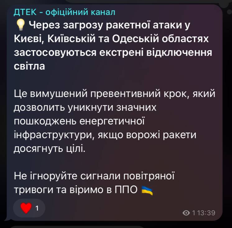 Ранее сообщалось, что в результате атаки одна украинская ТЭС прекратила производство электроэнергии, а вторая пострадала, но продолжает работать.