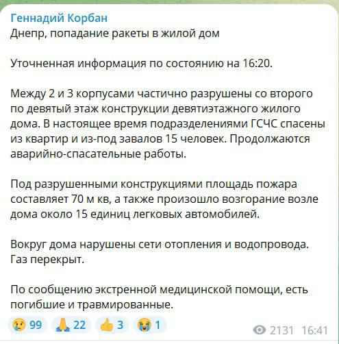 22:00 Количество жертв удара по Днепру выросло. В завалах многоэтажки уже девять погибших, сообщил губернатор Резниченко. Среди них - 15-летняя девочка.