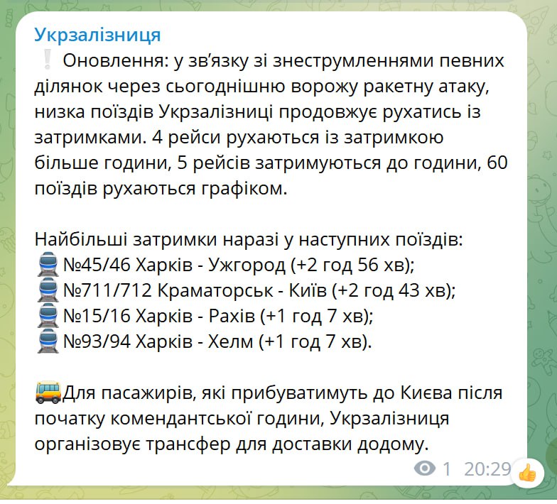21:33 Из-за обстрелов несколько поездов "Укрзализныци" задерживаются. Почти на три часа опаздывают составы "Харьков-Ужгород" и "Краматорск-Киев".