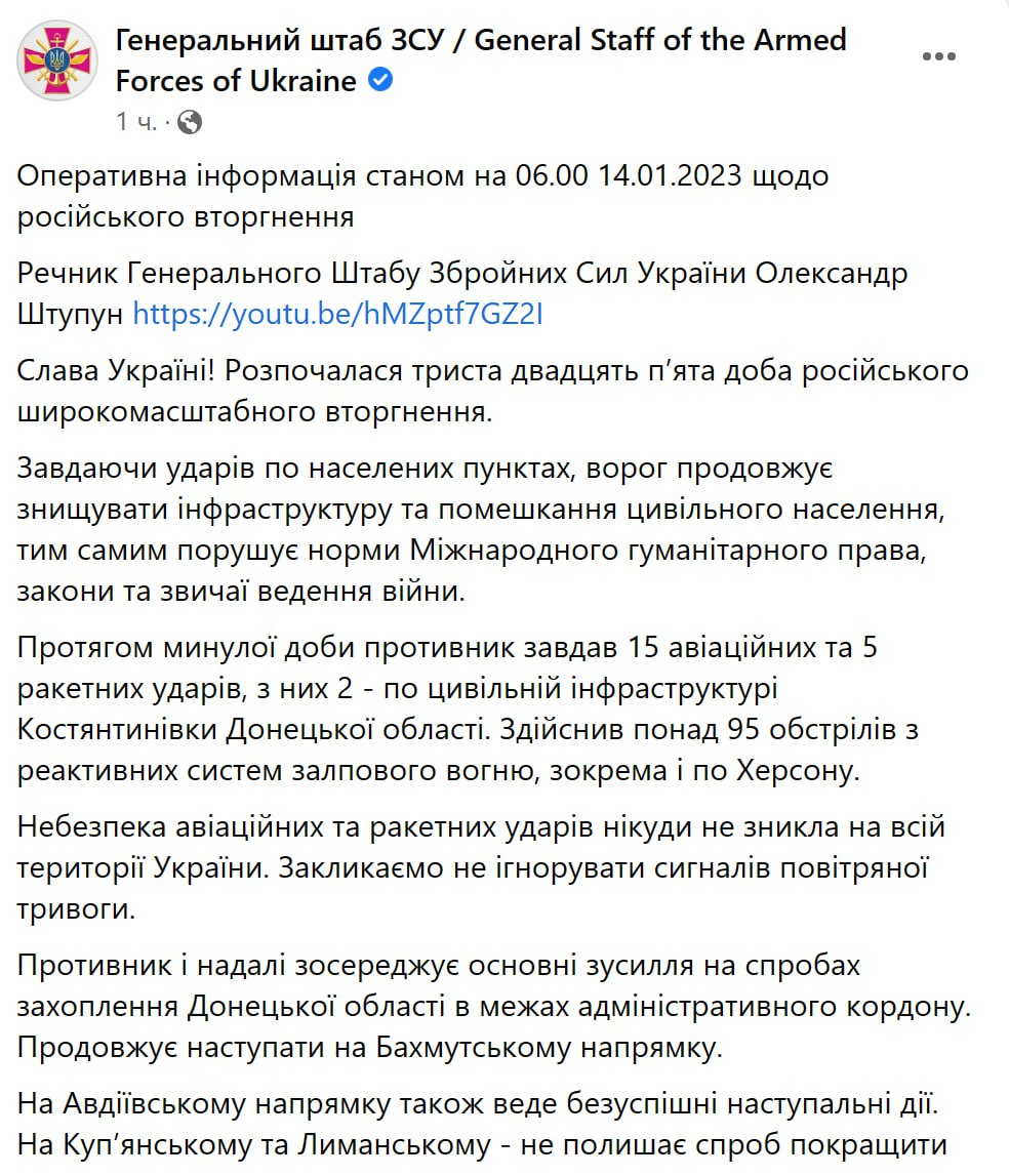 Война в Украине продолжается уже 325-й день. Мы следим за новостями 14 января в своем онлайне.