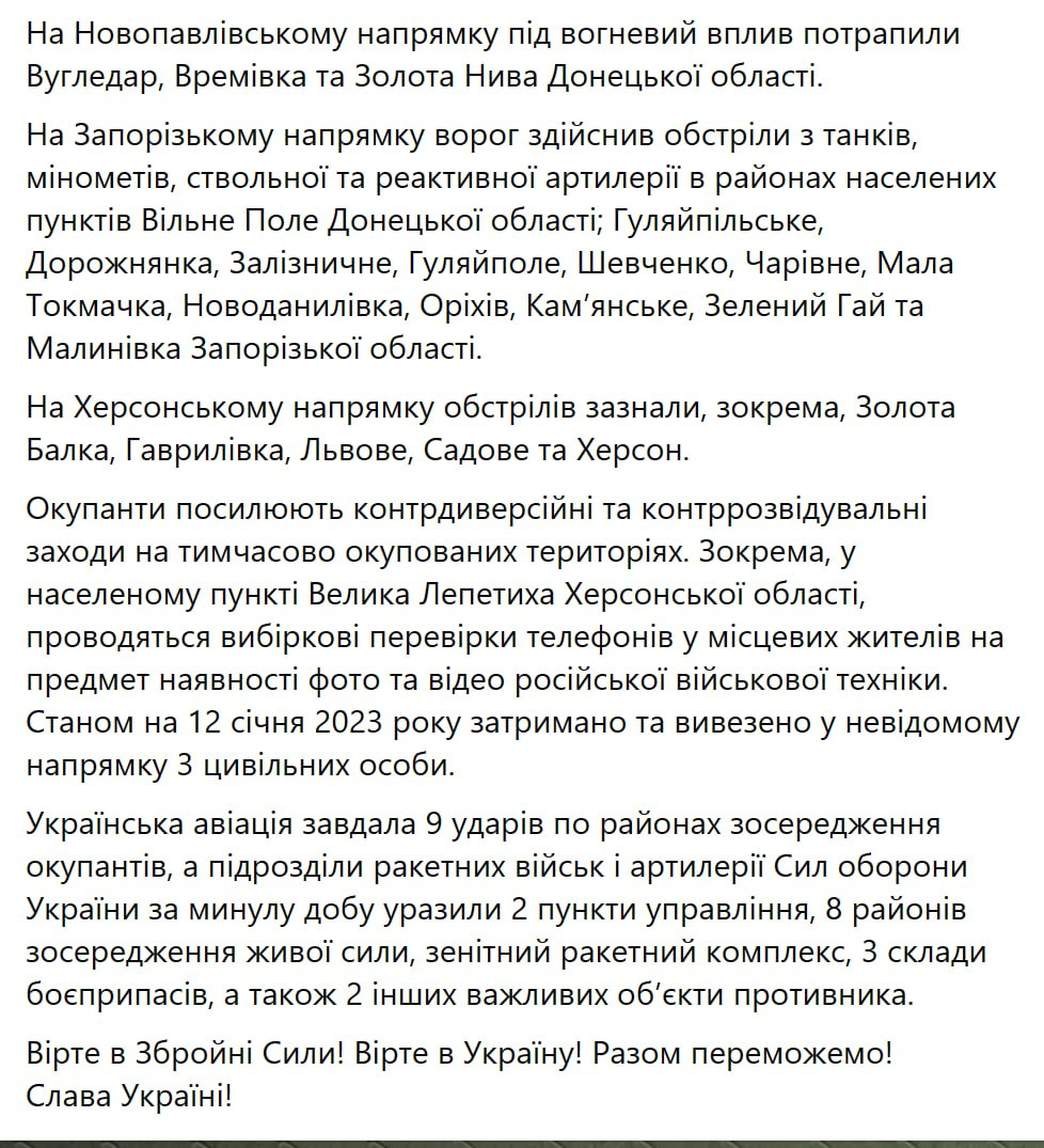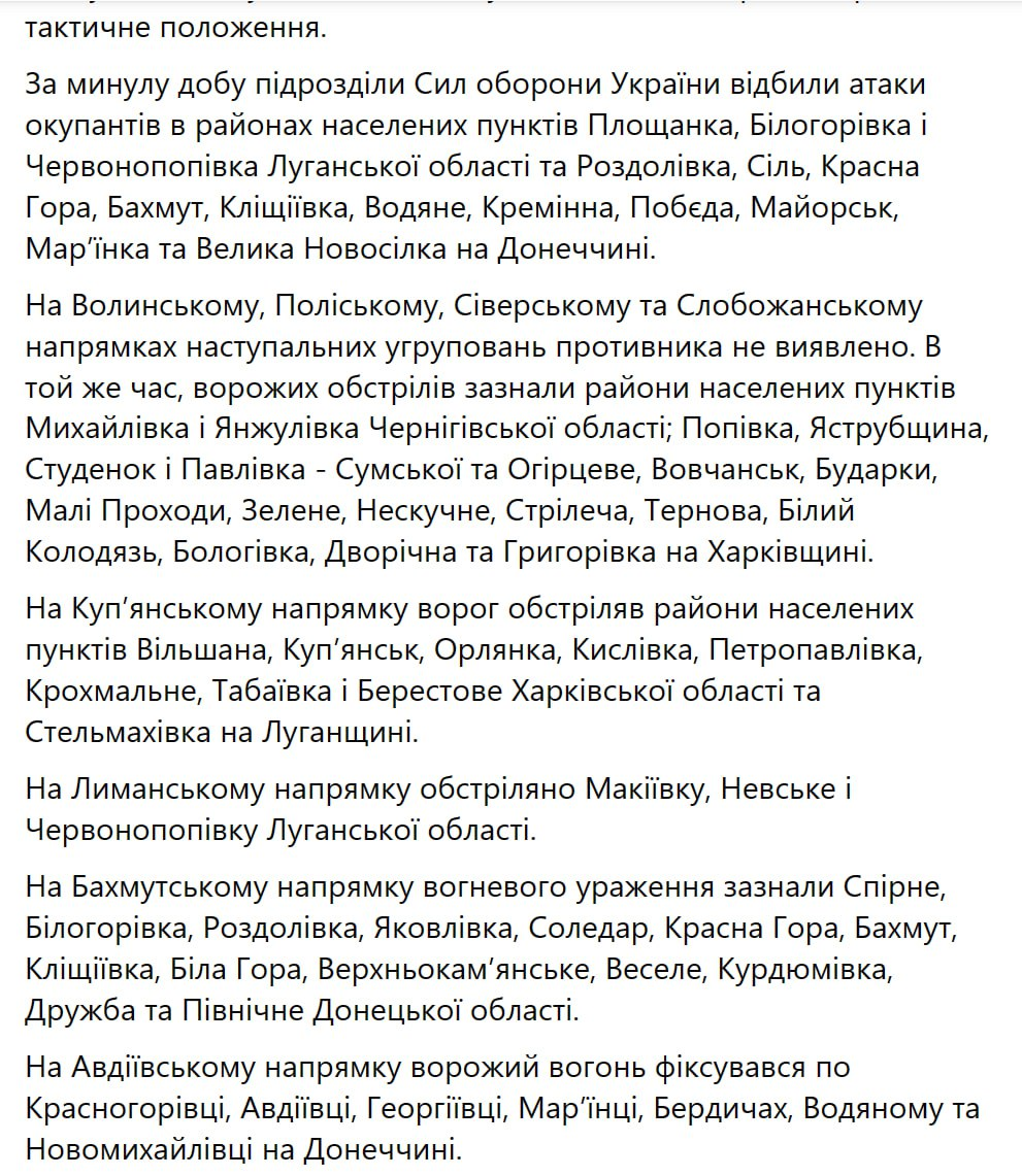 Генштаб ВСУ опубликовал утреннюю сводку с фронта. Фото: Facebook