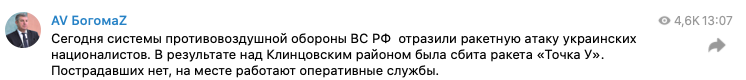 Губернатор Брянской области Александр Богомаз заявил, что российские ПВО сбили ракету "Точка У" в небе над Клинцовским районом.