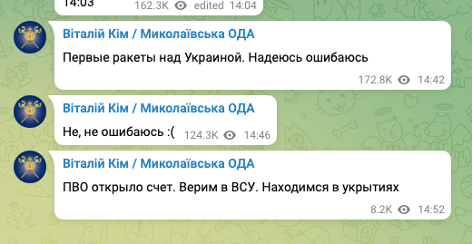Николаевский губернатор Виталий Ким заявил о первых российских ракетах в небе над Украиной, о массовом пуске которых сегодня с утра предупреждали местные власти.