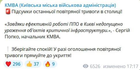 Зато в Киеве удалось избежать поражения объектов критической инфраструктуры благодаря работе ПВО, сообщает глава Киевской горадминистрации Сергей Попко.