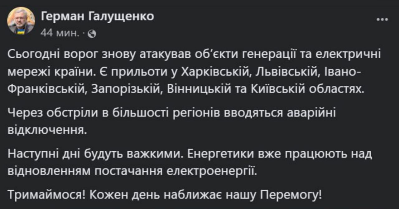 Глава Минэнерго Герман Галущенко предупреждает, что следующие дни в энергетике будут трудными.
