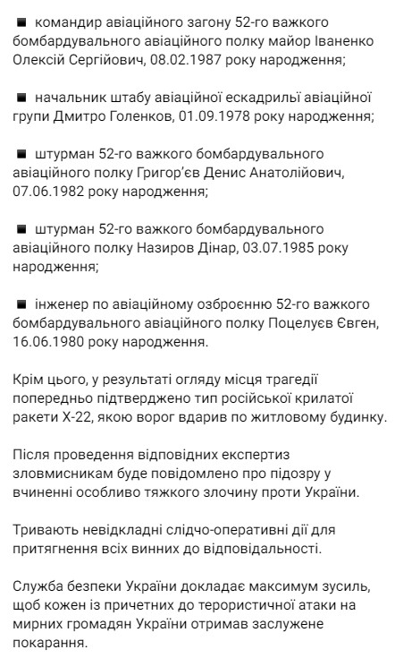 Кроме того, СБУ заявила, что "в результате осмотра места трагедии предварительно подтвержден тип российской крылатой ракеты Х-22, которой враг ударил по жилому дому".