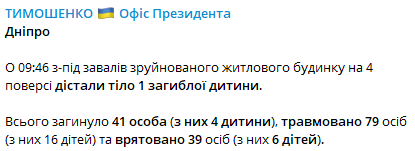 "Днепр. В 09:46 из-под завалов разрушенного жилого дома на 4 этаже достали тело одного погибшего ребенка. Всего погиб 41 человек (из них 4 ребенка), травмированы 79 человек (из них 16 детей) и спасены 39 лиц (из них 6 детей)", - написал замглавы Офиса президента Кирилл Тимошенко у себя в телеграм-канале.